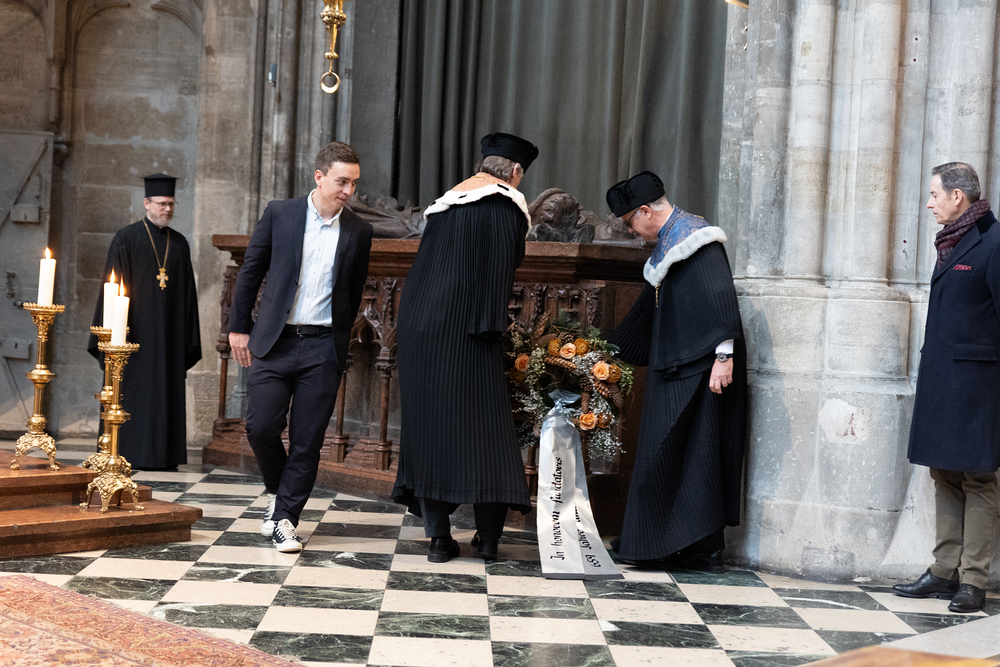 Der „Dies Academicus“ beginnt am Vormittag mit der vom Universitätsbund „Alma mater Rudolphina“ begründeten Tradition der Kranzniederlegung am leeren Kenotaph Rudolfs des Stifters im Stephansdom. Nach dem feierlichen Einzug und der Kranzniederlegung halten ein Vertreter des Domkapitels und der Rektor kurze Ansprachen. Anschließend zieht man gemeinsam vom Seitenschiff des Domes in die Krypta zum Grab Rudolfs des Stifters, wo die Feier nach einem kurzen Gebet endet.